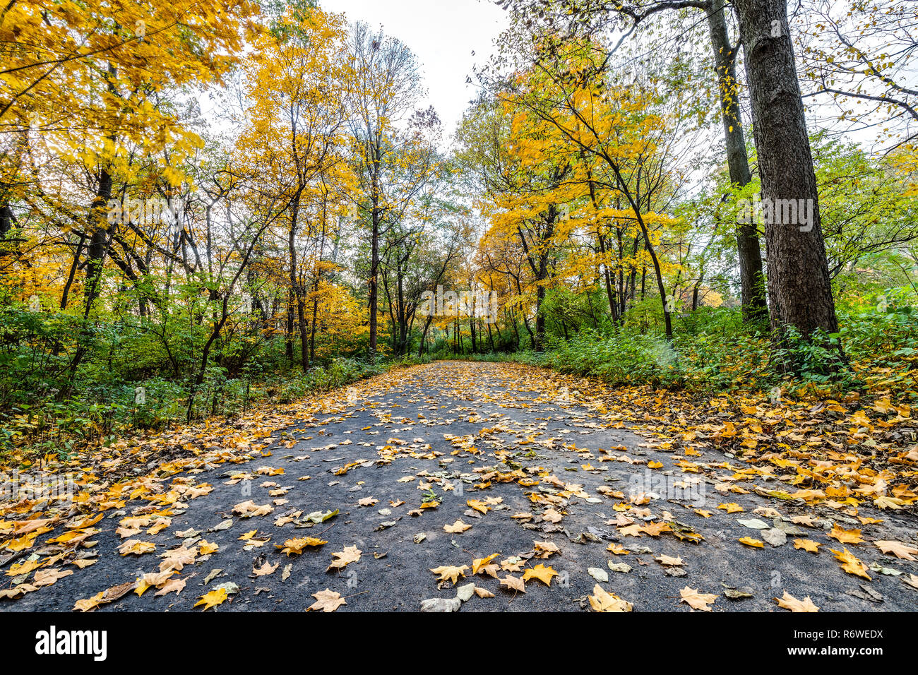 A Forest Paved Path In The Fall With The Foliage Turning Yellow Orange And The Leaves Falling Off Of The Trees Stock Photo Alamy